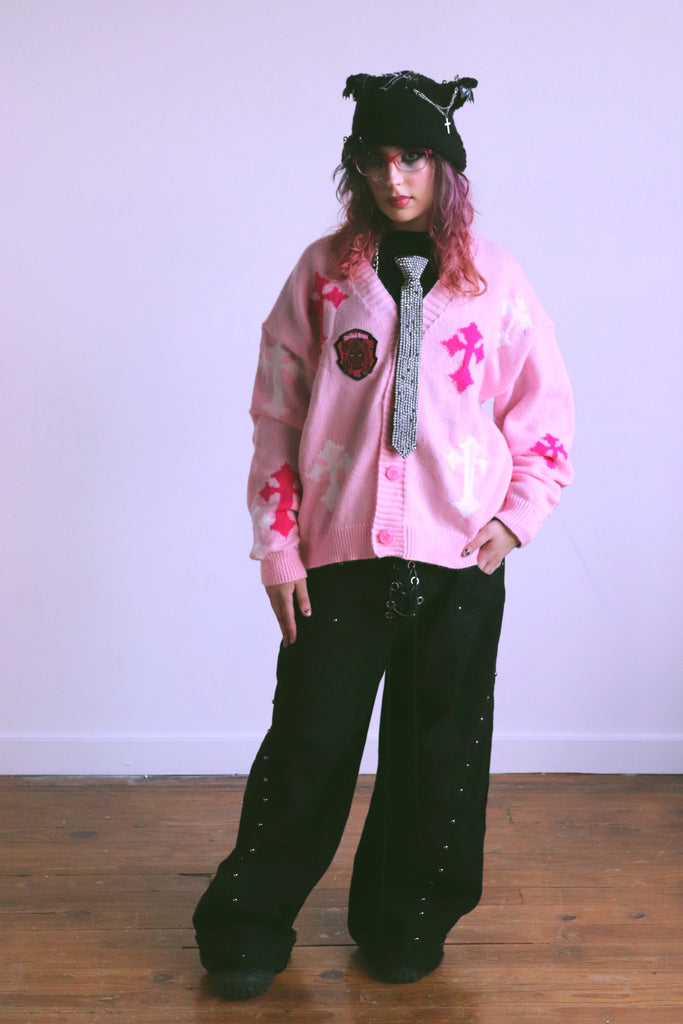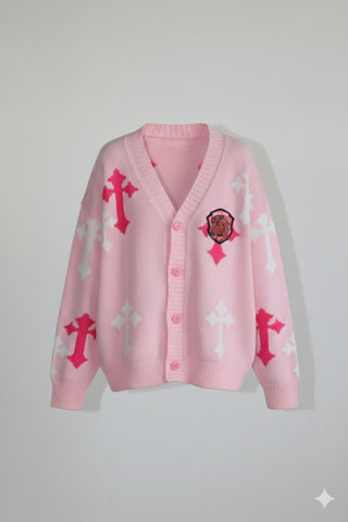 The Pink Venom Knit flips the script on traditional streetwear. Combining a soft, bubblegum aesthetic with hardcore iconography, this cardigan is for those who aren't afraid to be the loudest in the room. Featuring high-contrast hot pink and white "Shattered Cross" motifs and our signature Medusa Crest patch, this piece balances "cozy" and "chaotic" perfectly.